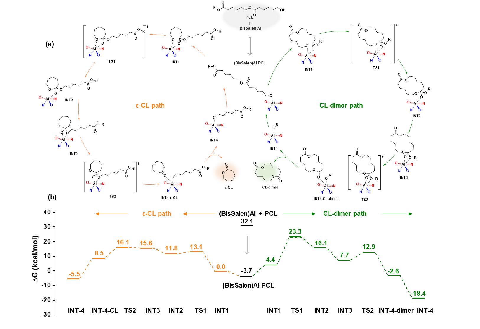 基于以上研究基础,研究团队将该空间受限催化剂设计策略进一步应用于PCL的溶剂解聚(图1)。通过对催化剂的结构优化,(BisSalen)Al催化剂催化PCL解聚的单体选择性可高达99%,收率达到93%,消除了环状二聚体副产物的生成,显著优于常规聚酯解聚催化剂的催化效果。为了深入理解高选择性机制,研究人员进行了详细的控制实验与DFT计算。研究表明,可控的链末端回咬是解聚过程中的主要机制,并进一步揭示了己内酯单体和二聚体形成途径中催化剂催化羰基配位和闭环回咬的显著能垒差异(图2)。此外,回收的己内酯单体可重新聚合完成闭环循环。该项研究揭示了催化剂结构与解聚选择性之间的相关性,为定向解聚催化剂的设计提供了理论指导。