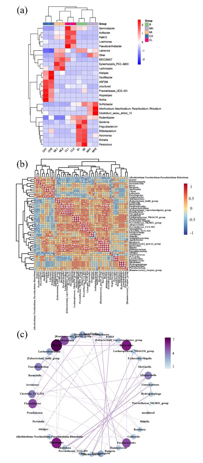 首先,分析了麦可藻对海水青鳉生长表现、营养组成变化、肠道微生物及繁殖的影响。研究结果显示,饲喂微藻组的鱼体表现均优于对照组。麦克藻可显著提高海水青鳉的增重率和特定生长率;鱼体多不饱和脂肪酸含量,尤其α-亚麻酸等关键脂肪酸含量显著高于小球藻组和人工饲料组。此外,麦克藻的EAA/NEAA>60%,符合FAO/WHO推荐的优质蛋白质特征。研究还发现,麦可藻可显著增强海水青鳉肠道微生物群的多样性,拟杆菌属等有益菌相对丰度升高,弧菌等致病菌相对丰度降低(图2);麦可藻组海水青鳉的受精率高达90.67%,显著高于其他实验组。