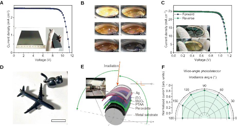 此外,本研究突破了传统平面制备的限制,在具有高斯曲率的刚性曲面(非可展曲面)上实现了无旋涂的高效钙钛矿器件制备,曲面太阳能电池效率超过23.2%。该喷涂策略还支持从纳米到微米尺度的膜厚连续调控,并可直接应用于复杂三维结构和图案化沉积。