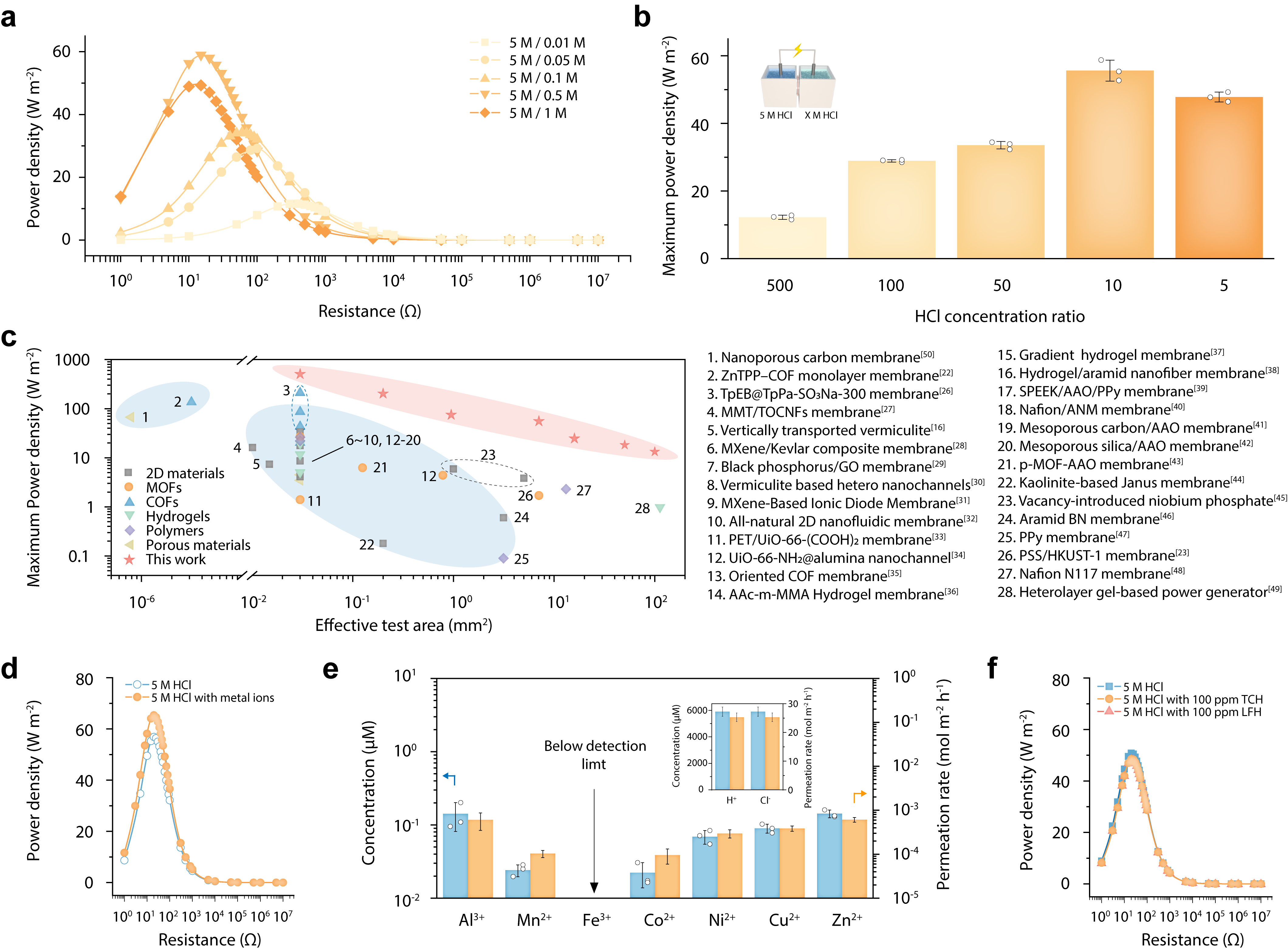渗透能捕获性能直接决定了氯气生产的效率,研究人员还系统探究了在不同浓度梯度下系统的渗透能捕获能力(图2)。在10倍的浓度梯度下,输出功率密度峰值可达55 W m-2,远高于先前的膜材料,且该性能可稳定维持超过15天无明显衰减。即使在模拟废酸中加入高浓度的重金属离子和有机污染物,磺化COF膜仍展现出卓越的抗污染能力和极低的金属离子渗透率。