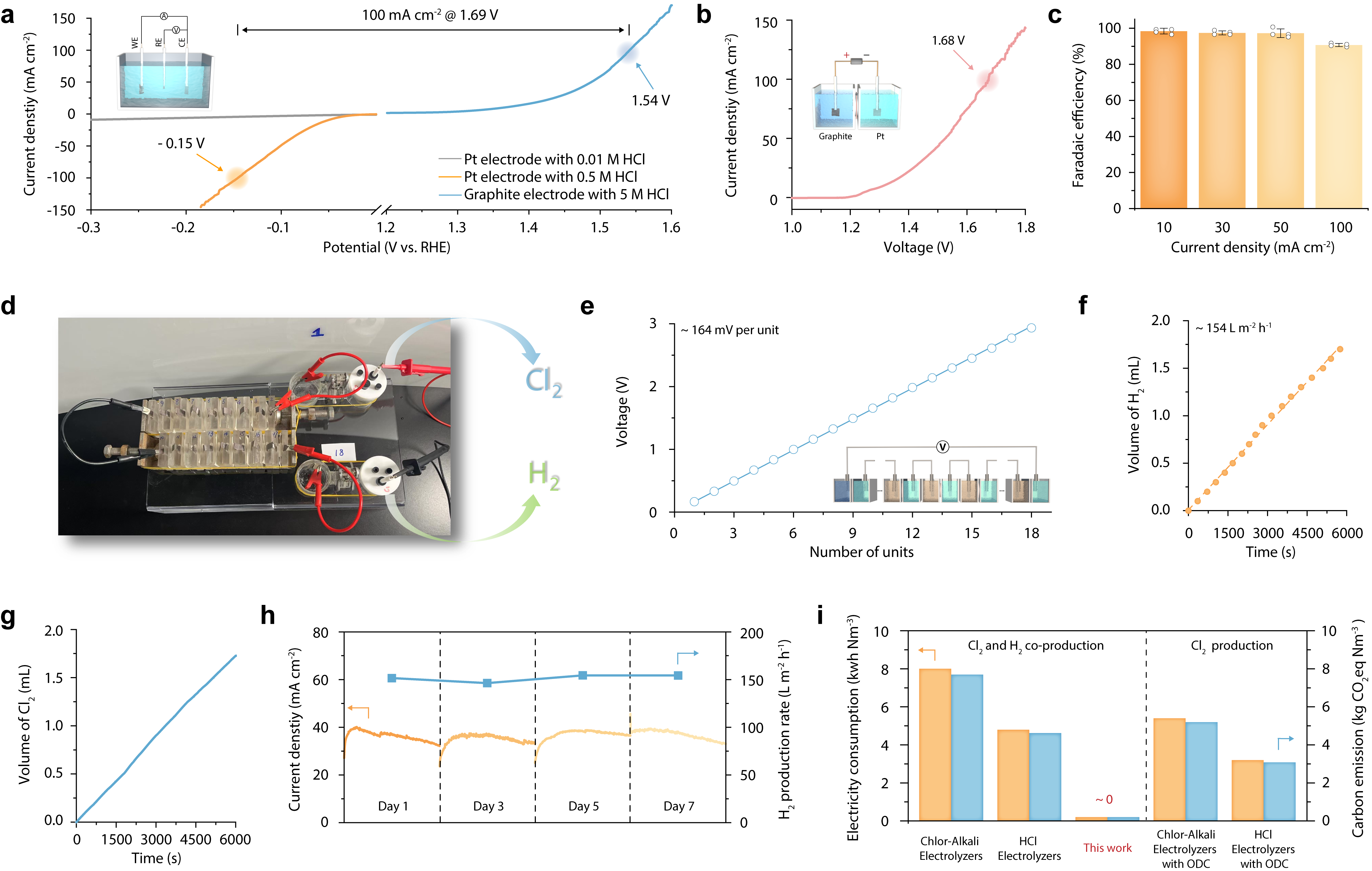通过串联多组发电单元构建装置,研究团队实现了氯气和氢气的自发生产(图3)。采用18组单元串联装置时,氢气和氯气的产率均能够超过150 L m-2 h-1,并可稳定运行至少7天。与传统电解工艺相比,该系统无需外部电力输入,大幅降低了氯气生产的碳排放和成本。该方法具有良好的适用性,已在模拟脱盐废水中验证氯气生产,并有望扩展至硝酸盐废水,实现氨气等其他关键化学品的自发生产。