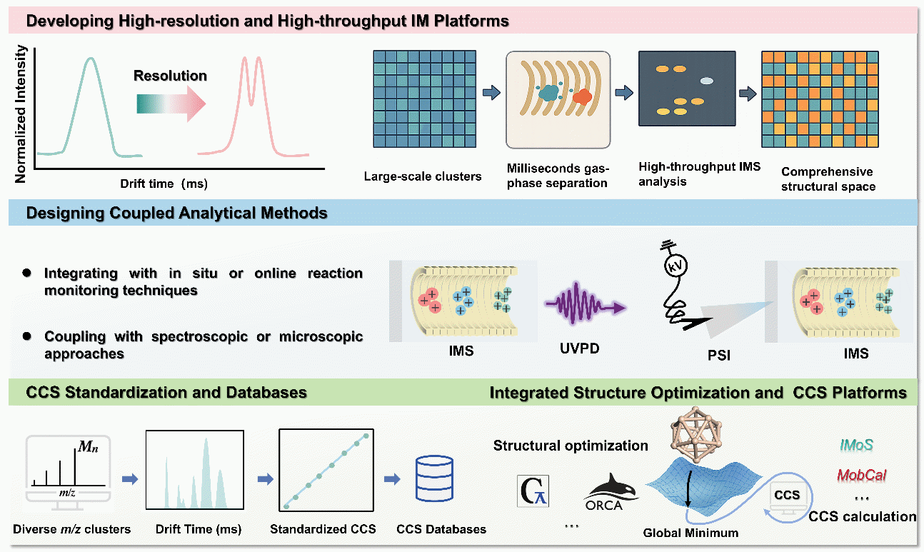 该综述首先介绍了不同类型离子迁移质谱的基本原理与技术特点,并对其在分辨率、灵敏度及适用体系等方面进行了对比分析。随后,重点总结了IM-MS在不同类型金属纳米团簇中的应用进展,包括掺杂位点识别、配体交换/去除过程解析、结构异构体分离及反应中间体的表征等(图1)。最后,针对IM-MS在团簇结构表征中面临的挑战进行了分析,如气相与凝聚相结构差异问题、CCS标准化与校准体系不足以及理论计算精度有限等,并进一步展望了未来发展方向,包括提高仪器分辨率、发展淌度质谱与其它技术联用、建立标准化数据库及引入机器学习等(图2),以推动金属纳米团簇的结构解析与功能设计研究。
